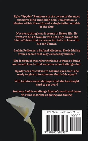 Ryko "Spyder" Rymbersa is the owner of the most exclusive kink and fetish club, Temptation. A Master within the club and a single father outside the club. Not everything is as it seems in Ryko's life. He wants to find a woman who not only craves the kind of kinks he does, but falls in love with his son Tanner. Larkin Pedience, a Shibari Mistress. She is hiding from a secret that may eventually find her. She is tired of men who think she is weak or dumb and would love to find someone who challenges her. Spyder sees his future in Larkin's eyes, but is he ready to give in to someone that is his equal? Will Larkin's secret damage what she has fought hard to get over? And can Larkin challenge Spyder's world and learn the true meaning of giving and taking.