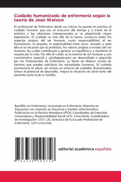 El profesional de Enfermería desde sus inicios ha puesto en práctica el cuidado humano que, con el trascurrir del tiempo y a través de la práctica y las relaciones interpersonales, se va adquiriendo mayor experiencia. El cuidado va más allá de la teoría, involucra todos los aspectos propios del ser humano, como responsabilidad, el ser humanitario, la empatía, la espiritualidad entre otros. Sumado a todo ello es la vocación por la profesión, los valores propios e innatos del ser humano, los cuales contribuyen a generar un equilibrio y a mantener el respeto por la vida. Por ello el cuidar, es la esencia de ser humano y una característica especial y privilegiada para ser desarrollada o adquirida por los Profesionales de Enfermería. La Teoría de Watson consta de factores que pueden satisfacer las necesidades humanas. El cuidado promociona la salud, así mismo un entorno de cuidados Humanizados ofrece el potencial de desarrollo, mejora la situación de salud tanto del paciente como la de su familia.