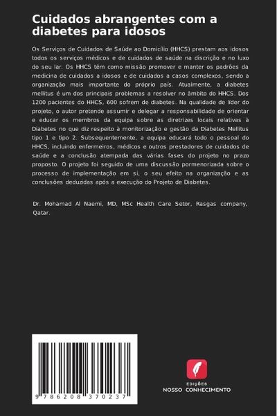 Os Serviços de Cuidados de Saúde ao Domicílio (HHCS) prestam aos idosos todos os serviços médicos e de cuidados de saúde na discrição e no luxo do seu lar. Os HHCS têm como missão promover e manter os padrões da medicina de cuidados a idosos e de cuidados a casos complexos, sendo a organização mais importante do próprio país. Atualmente, a diabetes mellitus é um dos principais problemas a resolver no âmbito do HHCS. Dos 1200 pacientes do HHCS, 600 sofrem de diabetes. Na qualidade de líder do projeto, o autor pretende assumir e delegar a responsabilidade de orientar e educar os membros da equipa sobre as diretrizes locais relativas à Diabetes no que diz respeito à monitorização e gestão da Diabetes Mellitus tipo 1 e tipo 2. Subsequentemente, a equipa educará todo o pessoal do HHCS, incluindo enfermeiros, médicos e outros prestadores de cuidados de saúde e a conclusão atempada das várias fases do projeto no prazo proposto. O projeto foi seguido de uma discussão pormenorizada sobre o processo de implementação em si, o seu efeito na organização e as conclusões deduzidas após a execução do Projeto de Diabetes.