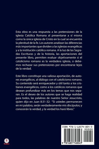 Esta obra es una respuesta a las pretensiones de la iglesia Católica Romana al presentarse a sí misma como la única iglesia de Cristo en la cual se encuentra la plenitud de la fe. Los autores analizan las diferencias más importantes que dividen a las iglesias evangélicas y a la institución católica romana. A la luz de las Sagradas Escrituras y de la historia, las aportaciones del presente libro, permiten evaluar objetivamente si el catolicismo romano es la verdadera iglesia, o debemos rechazar sus pretensiones por encontrarse lejos de la verdad. Este libro constituye una valiosa aportación, de autores evangélicos, al diálogo con el catolicismo romano. Su contenido será enriquecedor y útil tanto a los cristianos evangélicos, como a los católicos romanos que desean profundizar más en los temas que nos separan. Es el deseo de los autores que se haga realidad para todos, las palabras de nuestro Señor Jesucristo, quien dijo en Juan 8:31-32: "Si ustedes permanecen en mi palabra, serán verdaderamente mis discípulos; y conocerán la verdad, y la verdad los hará libres."