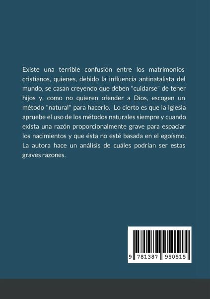 Existe una terrible confusión entre los matrimonios cristianos, quienes, debido la influencia antinatalista del mundo, se casan creyendo que deben "cuidarse" de tener hijos y, como no quieren ofender a Dios, escogen un método "natural" para hacerlo. Lo cierto es que la Iglesia apruebe el uso de los métodos naturales siempre y cuando exista una razón proporcionalmente grave para espaciar los nacimientos y que ésta no esté basada en el egoísmo. La autora hace un análisis de cuáles podrían ser estas graves razones.