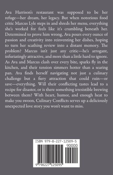 Ava Harrison's restaurant was supposed to be her refuge-her dream, her legacy. But when notorious food critic Marcus Lyle steps in and shreds her menu, everything she's worked for feels like it's crumbling beneath her. Determined to prove him wrong, Ava pours every ounce of passion and creativity into reinventing her dishes, hoping to turn her scathing review into a distant memory. The problem? Marcus isn't just any critic-he's arrogant, infuriatingly attractive, and more than a little hard to ignore. As Ava and Marcus clash over every bite, sparks fly in the kitchen, and their tension simmers hotter than a searing pan. Ava finds herself navigating not just a culinary challenge but a fiery attraction that could ruin-or save-everything. Will their conflicting tastes lead to a recipe for disaster, or is there something irresistible brewing between them? With heart, humor, and enough heat to make you swoon, Culinary Conflicts serves up a deliciously unexpected love story you won't want to miss.