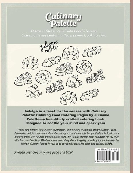 Indulge in a feast for the senses with Culinary Palette: Calming Food Coloring Pages by Julienne Palette-a beautifully crafted coloring book designed to soothe your mind and spark your creativity. Relax with intricate food-themed illustrations, from elegant desserts to global cuisines, while discovering delicious recipes and handy cooking tips scattered right trough. Perfect for food lovers, creative cooks, and anyone seeking stressrelief, this unique coloring book combines the joy of art with the love ofcooking. Whether you're unwinding after a long day or looking for inspiration in thekitchen, Culinary Palette is your go-to escape for creativity, calm, and culinarydelight. Unleash your creativity, one page at a time!