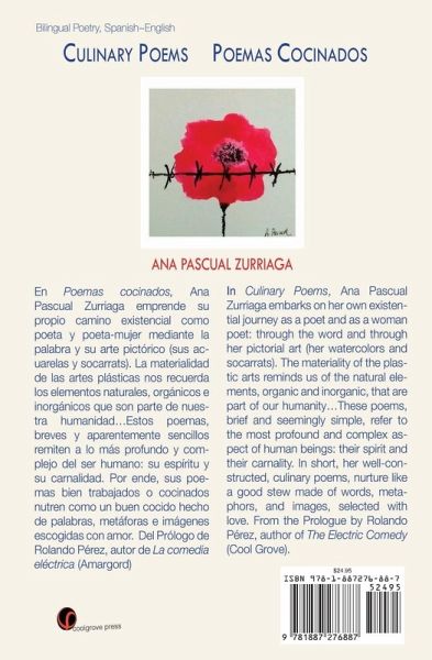 In Culinary Poems, Ana Pascual Zurriaga embarks on her own existential journey as a poet and as a woman poet: through the word and through her pictorial art (her watercolors and socarrats). The materiality of the plastic arts reminds us of the natural elements, organic and inorganic, that are part of our humanity...These poems, brief and seemingly simple, refer to the most profound and complex aspect of human beings: their spirit and their carnality. In short, her well-constructed, culinary poems, nurture like a good stew made of words, metaphors, and images, selected with love. From the Prologue by Rolando Pérez, author of The Electric Comedy (Cool Grove).