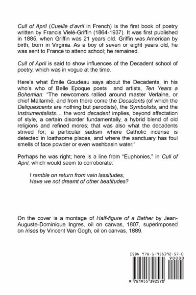 Cull of April (Cueille d¿avril in French) is the first book of poetry written by Francis Vielé-Griffin (1864-1937). It was first published in 1885, when Griffin was 21 years old. Griffin was American by birth, born in Virginia. As a boy of seven or eight years old, he was sent to France to attend school; he remained. Cull of April is said to show influences of the Decadent school of poetry, which was in vogue at the time. Here is what Émile Goudeau says about the Decadents, in his whös who of Belle Epoque poets and artists, Ten Years a Bohemian: "The newcomers rallied around master Verlaine, or chief Mallarmé, and from there come the Decadents (of which the Deliquescents are nothing but parodists), the Symbolists, and the Instrumentalists.... the word decadent implies, beyond affectation of style, a certain disorder fundamentally, a hybrid blend of old religions and refined mores; that was also what the decadents strived for; a particular sadism where Catholic incense is detected in loathsome places, and where the sanctuary has foul smells of face powder or even washbasin water." Perhaps he was right, here¿s a line from "Euphonies," in Cull of April, which would seem to corroborate: I ramble on return from vain lassitudes, Have we not dreamt of other beatitudes?
