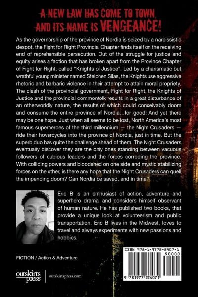 A new law is coming to town, and its name is VENGEANCE! As the governorship of the province of Nordia is seized by a narcissistic despot, the Fight for Right Provincial Chapter finds itself on the receiving end of reprehensible persecution. Out of the struggle for justice and equity arises a faction that has broken apart from the Province Chapter of Fight for Right, called "Knights of Justice". Led by a charismatic but wrathful young minister named Steiphen Silas, the Knights use aggressive rhetoric and barbaric violence in their attempt to attain moral propriety. The clash of the provincial government, Fight for Right, the Knights of Justice and the provincial commonfolk results in a great disturbance of an otherworldly nature, the results of which could conceivably doom and consume the entire province of Nordia…for good! And yet there may be one hope. Just when all seems to be lost, North America's most famous superheroes of the third millennium - the Night Crusaders - ride their hovercycles into the province of Nordia, just in time. But the superb duo has quite the challenge ahead of them. The Night Crusaders eventually discover they are the only ones standing between vacuous followers of dubious leaders and the forces corroding the province. With colliding powers and bloodshed on one side and mystic stabilizing forces on the other, is there any hope that the Night Crusaders can quell the impending doom? Can Nordia be saved, and in time?