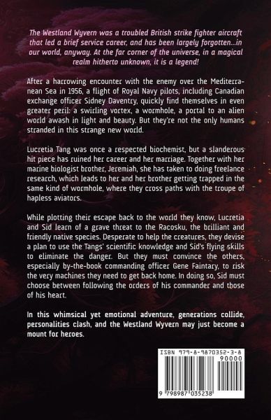 The Westland Wyvern was a troubled British strike fighter aircraft that led a brief service career, and has been largely forgotten...in our world, anyway. At the far corner of the universe, in a magical realm hitherto unknown, it is a legend! After a harrowing encounter with the enemy over the Mediterranean Sea in 1956, a flight of Royal Navy pilots, including Canadian exchange officer Sidney Daventry, quickly find themselves in even greater peril: a swirling vortex, a wormhole, a portal to an alien world awash in light and beauty. But they're not the only humans stranded in this strange new world. Lucretia Tang was once a respected biochemist, but a slanderous hit piece has ruined her career and her marriage. Together with her marine biologist brother, Jeremiah, she has taken to doing freelance research, which leads to her and her brother getting trapped in the same kind of wormhole, transported to the same corner of the universe, where they cross paths with the troupe of hapless aviators. While plotting their escape back to the world they know, Lucretia and Sid learn of a grave threat to the Racosku, the brilliant and friendly native species. Desperate to help the creatures, they devise a plan to use the Tangs' scientific knowledge and Sid's flying skills to eliminate the danger. But they must convince the others, especially by-the-book commanding officer Gene Faintary, to risk the very machines they need to get back home. In doing so, Sid must choose between following the orders of his commander and those of his heart. In this whimsical yet emotional adventure, generations collide, personalities clash, and the Westland Wyvern may just become a mount for heroes.