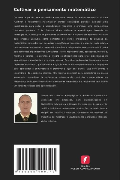Desperte a paixão pela matemática nos seus alunos do ensino secundário! O livro "Cultivar o Pensamento Matemático" oferece estratégias práticas, apoiadas pela investigação, para evitar a aprendizagem mecânica e promover uma compreensão concetual profunda. O Dr. Gamboa Graus defende a aprendizagem baseada na investigação, a resolução de problemas do mundo real e o poder de aproveitar os erros para crescer. Descubra como combater os efeitos prejudiciais da privação da matemática, revelados por pesquisas neurológicas recentes, e capacite cada criança para se tornar um pensador matemático confiante, adaptável e para toda a vida. Explore seis poderosos organizadores curriculares - erros, representações, aplicações, materiais, história e valores - e aprenda a integrá-los eficazmente para criar experiências de aprendizagem envolventes e enriquecedoras. Descubra pedagogias inovadoras como "aprender ensinando", que aproveita a ligação crucial entre o pensamento e a linguagem para aprofundar a compreensão e promover a ação dos alunos. Este livro aborda a importância da coerência didática. Um recurso essencial para educadores do ensino secundário, formadores de professores, criadores de currículos e especialistas em matemática dedicados a transformar o ensino da matemática e a inspirar nos seus alunos um verdadeiro gosto pela aprendizagem.