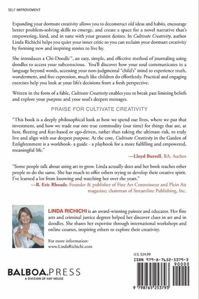 Expanding your dormant creativity allows you to deconstruct old ideas and habits, encourage better problem-solving skills to emerge, and create a space for a novel narrative that's empowering, kind, and in tune with your greatest desires. In Cultivate Creativity, author Linda Richichi helps you quiet your inner critic so you can reclaim your dormant creativity by forming new and inspiring stories to live by. She introduces a Chi-Doodle, an easy, simple, and effective method of journaling using doodles to access your subconscious. You'll discover how your soul communicates in a language beyond words, accessing your non-judgmental "child's" mind to experience truth, wonderment, and free expression, much like children do effortlessly. Practical and engaging exercises help you look at your life's decisions from a fresh perspective. Written in the form of a fable for children, Cultivate Creativity enables you to break past limiting beliefs and explore your purpose and your soul's deepest messages. Praise for Cultivate Creativity "This book is a deeply philosophical look at how we spend our lives, where we put that investment, and how we trade our one true commodity (our time) for things that are, at best, fleeting and fear-based or ego-driven, rather than taking the ultimate risk, to truly live and align with our deepest purpose. At the core, Cultivate Creativity in the Garden of Enlightenment is a workbook- a guide - a playbook for a more fulfilling and empowered, meaningful life." -Lloyd Burrell, Author "Some people talk about using art to grow. Linda actually does and her book teaches other people to do the same. She has much to offer others trying to develop their creative spirit. I've learned a lot from knowing and watching her over the years." -B. Eric Rhoads, Founder & publisher of Fine Art Connoisseur and Plein Air magazine; chairman of Streamline Publishing, Inc.