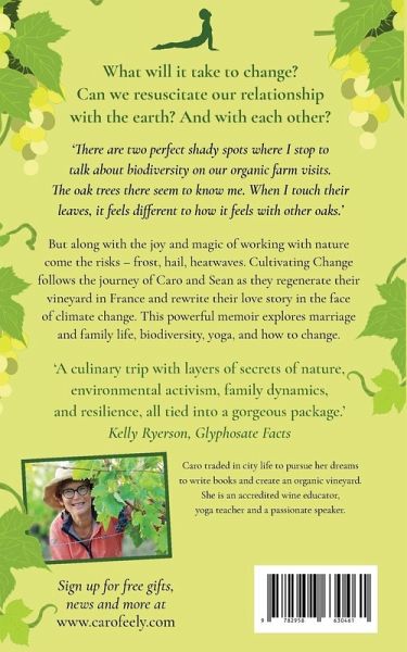 What will it take to change? Can we revive our relationship with the earth? And with each other? 'There are two perfect shady spots where I stop to talk about biodiversity on our organic farm visits. The oak trees there seem to know me. When I touch their leaves, it feels different to how it feels with other oaks.' But along with the joy and magic of working with nature come the risks - frost, hail, heatwaves. Cultivating Change follows the journey of Caro and Sean as they regenerate their vineyard in France and rewrite their love story in the face of climate change. This powerful memoir explores marriage and family life, biodiversity, yoga, and how to change. Reviews 'Powerful and inspiring' Jacqui Brown, Book blogger 'A must read. Passionate, challenging, and informative.' Helen Melser, Author 'A culinary trip with layers of secrets of nature, environmental activism, family dynamics, and resilience, all tied into a gorgeous package.' Kelly Ryerson, Glyphosate Facts 'A thoroughly enjoyable read and a wake-up call about how our actions affect our planet.' Tora Shand 'I have heard it said that time changes things, but sometimes you have to change them yourself. In Cultivating Change Caro Feely confronts both sides of this saying, adapting to the effects of time on family and relationships, while simultaneous seeking to shape the world - especially the wine world - to meet the challenges of the future. Insightful and inspiring.' Mike Veseth, The Wine Economist Primary themes: Climate change, Marriage, Wine, Vineyards, Organic farming, Regenerative farming, Biodiversity, Yoga, Personal awakening, Follow your Dreams. Secondary themes: Raising teenagers as a working mother, Transitioning to the empty nest, Gastronomy, Voyages in France, South Africa, Ireland, Italy, Japan and the United Kingdom.