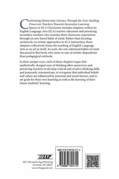 This edited book includes chapters written by English Language Arts (ELA) teacher educators and practicing secondary teachers who examine their classroom experiences through an arts-based habit of mind. Rather than focusing exclusively on artistic approaches to ELA instruction, these chapters collectively frame the teaching of English Language Arts as an art in itself. As such, the arts-informed habits of mind discussed in this book refer more to sets of artistic dispositions than pedagogical methods. In their unique ways, each of these chapters argue that aesthetically charged ways of thinking allow preservice and practicing teachers to develop critical and creative thinking skills and purposely communicate, to recognize that individual beliefs and values are influenced by personal and social factors, and to set goals for their own learning as well as the learning of their future students' learning.