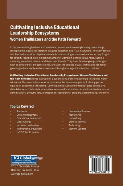 In the ever-evolving landscape of academia, women are increasingly taking center stage, reshaping the leadership narrative in higher education and K-12 institutions. The early female scholars and educators played a pivotal role in advancing women's education as they fought for equality resulting in an increasing number of women in administrative roles, such as university presidents, deans, and department heads. They have faced ongoing challenges such as gender bias, the glass ceiling, and work-life balance issues. Institutions can foster greater gender equality and empowerment through strategic initiatives and policies. Cultivating Inclusive Educational Leadership Ecosystems: Women Trailblazers and the Path Forward delves into women's dynamic and transformative role in shaping higher education. This comprehensive work provides actionable strategies for fostering gender equality in educational leadership. Covering topics such as mentorship, glass ceiling, and state takeovers, this book is an excellent resource for educators, educational leaders, school administrators, policymakers, professionals, researchers, scholars, academicians, and more.