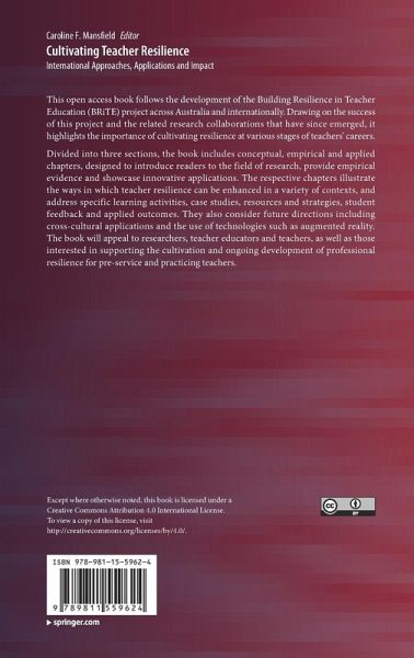 This open access book follows the development of the Building Resilience in Teacher Education (BRiTE) project across Australia and internationally. Drawing on the success of this project and the related research collaborations that have since emerged, it highlights the importance of cultivating resilience at various stages of teachers' careers. Divided into three sections, the book includes conceptual, empirical and applied chapters, designed to introduce readers to the field of research, provide empirical evidence and showcase innovative applications. The respective chapters illustrate the ways in which teacher resilience can be enhanced in a variety of contexts, and address specific learning activities, case studies, resources and strategies, student feedback and applied outcomes. They also consider future directions including cross-cultural applications and the use of technologies such as augmented reality. The book will appeal to researchers, teacher educators and teachers, as well as those interested in supporting the cultivation and ongoing development of professional resilience for pre-service and practicing teachers.