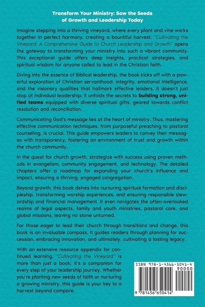 Transform Your Ministry: Sow the Seeds of Growth and Leadership Today Imagine stepping into a thriving vineyard, where every plant and vine works together in perfect harmony, creating a bountiful harvest. "Cultivating the Vineyard: A Comprehensive Guide to Church Leadership and Growth" opens the gateway to transforming your ministry into such a vibrant community. This exceptional guide offers deep insights, practical strategies, and spiritual wisdom for anyone called to lead in the Christian faith. Diving into the essence of Biblical leadership, the book kicks off with a powerful exploration of Christian servanthood, integrity, emotional intelligence, and the visionary qualities that hallmark effective leaders. It doesn't just stop at individual leadership; it unfolds the secrets to building strong, unified teams equipped with diverse spiritual gifts, geared towards conflict resolution and reconciliation. Communicating God's message lies at the heart of ministry. Thus, mastering effective communication techniques, from purposeful preaching to pastoral counseling, is crucial. This guide empowers leaders to convey their messages with transparency, fostering an environment of trust and growth within the church community. In the quest for church growth, strategize with success using proven methods in evangelism, community engagement, and technology. The detailed chapters offer a roadmap for expanding your church's influence and impact, ensuring a thriving, engaged congregation. Beyond growth, this book delves into nurturing spiritual formation and discipleship, transforming worship experiences, and ensuring responsible stewardship and financial management. It even navigates the often-overlooked realms of legal aspects, family and youth ministries, pastoral care, and global missions, leaving no stone unturned. For those eager to lead their church through transitions and change, this book is an invaluable compass. It guides readers through planning for succession, embracing innovation, and ultimately, cultivating a lasting legacy. With an extensive resource appendix for continued learning, "Cultivating the Vineyard" is more than just a book; it's a companion for every step of your leadership journey. Whether you're planting new seeds of faith or nurturing a growing ministry, this guide is your key to a harvest beyond compare.