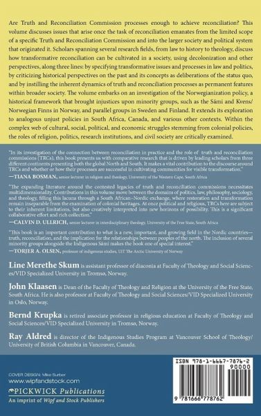 Are Truth and Reconciliation Commission processes enough to achieve reconciliation? This volume discusses issues that arise once the task of reconciliation emanates from the limited scope of a specific Truth and Reconciliation Commission and into the larger society and political system that originated it. Scholars spanning several research fields, from law to history to theology, discuss how transformative reconciliation can be cultivated in a society, using decolonization and other perspectives, along three lines: by specifying transformative issues and processes in law and politics, by criticizing historical perspectives on the past and its concepts as deliberations of the status quo, and by instilling the inherent dynamics of truth and reconciliation processes as permanent features within broader society. The volume embarks on an investigation of the Norwegianization policy, a historical framework that brought injustices upon minority groups, such as the Sami and Kvens (Norwegian Finns) in Norway, and parallel groups in Sweden and Finland. It extends its exploration to analogous unjust policies in South Africa, Canada, and various other contexts. Within the complex web of cultural, social, political, and economic struggles stemming from colonial policies, the roles of religion, politics, research institutions, and civil society are critically examined.