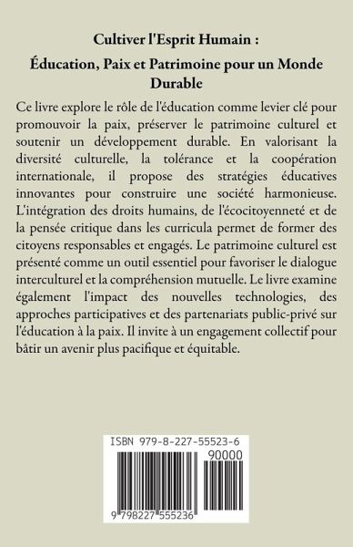 Ce livre explore le rôle de l'éducation comme levier clé pour promouvoir la paix, préserver le patrimoine culturel et soutenir un développement durable. En valorisant la diversité culturelle, la tolérance et la coopération internationale, il propose des stratégies éducatives innovantes pour construire une société harmonieuse. L'intégration des droits humains, de l'écocitoyenneté et de la pensée critique dans les curricula permet de former des citoyens responsables et engagés. Le patrimoine culturel est présenté comme un outil essentiel pour favoriser le dialogue interculturel et la compréhension mutuelle. Le livre examine également l'impact des nouvelles technologies, des approches participatives et des partenariats public-privé sur l'éducation à la paix. Il invite à un engagement collectif pour bâtir un avenir plus pacifique et équitable.