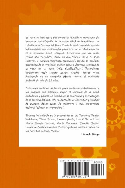 Esta obra contiene las bases para continuar enfatizando en las acciones que debemos seguir el personal de la salud, cuidadores y padres de familia, en la tolerancia y estrategias de la cultura del buen trato, aprender a identificar y manejar de manera idónea casos de maltrato y más importante todavía "Educar en Prevención ". Sigamos insistiendo en la propuesta de las Docentes Regina Rodríguez, Diana Bravo, Carmen Acuña, Luz E De la Cruz, María Claudia Vargas, María Barraza, Janeth Jinete, Laura de Castro docentes Investigadoras universitarias con las Cartillas de Buen Trato. producto de su trayectoria investigativa y profesional quienes desde una intensión interdisciplinar e integral plasmaron en este materia didáctico aspectos teóricos y prácticos que llevan a la reflexión pero sobre todo a la acción para promover el Buen Trato y aminorar las secuelas y el sufrimiento de aquellos que sufren maltrato. Unámonos a este equipo para seguir y extender la instrucción en las campañas de Prevención y Buen Trato.