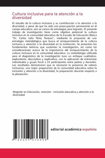 El estudio de la cultura inclusiva y su contribución a la atención a la diversidad, a pesar de que ha sido una preocupación permanente en el campo educativo, aún se carece de estrategias para lograrlo. El presente trabajo de investigación tiene como objetivo potencial la cultura inclusiva en la comunidad educativa de la Escuela de Educación Básica "Dr. Carlos Julio Pérez Perasso", mediante la propuesta de una estrategia metodológica que busca el enriquecimiento de la cultura inclusiva y atención a la diversidad en la institución. Se presentan los fundamentos teóricos que sustentan la investigación, así como las consideraciones acerca de la importancia del enriquecimiento de la cultura inclusiva en la comunidad educativa. La metodología utilizada para el diagnóstico de la investigación tuvo un enfoque cualitativo, exploratorio, descriptivo y explicativo, con la aplicación de entrevistas individuales y grupo focal a 24 participantes entre padres y docentes. Los resultados demostraron que es necesario la presencia de valores inclusivos, una mejor preparación de la comunidad educativa sobre la inclusión y atención a la diversidad, la preparación docente respecto a la planeación.