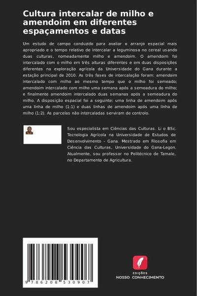 Um estudo de campo conduzido para avaliar o arranjo espacial mais apropriado e o tempo relativo de intercalar a leguminosa no cereal usando duas culturas, nomeadamente milho e amendoim. O amendoim foi intercalado com o milho em três alturas diferentes e em duas disposições diferentes na exploração agrícola da Universidade do Gana durante a estação principal de 2010. As três fases de intercalação foram: amendoim intercalado com milho ao mesmo tempo que o milho foi semeado; amendoim intercalado com milho uma semana após a semeadura do milho; e finalmente amendoim intercalado duas semanas após a semeadura do milho. A disposição espacial foi a seguinte: uma linha de amendoim após uma linha de milho (1:1) e duas linhas de amendoim após uma linha de milho (1:2). As parcelas não intercaladas serviram de controlo.
