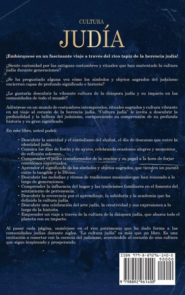 ¡Embárquese en un fascinante viaje a través del rico tapiz de la herencia judía! ¿Siente curiosidad por las antiguas costumbres y rituales que han sustentado la cultura judía durante generaciones? ¿Se ha preguntado alguna vez cómo los símbolos y objetos sagrados del judaísmo encierran capas de profundo significado e historia? ¿Le gustaría descubrir la vibrante cultura de la diáspora judía y su impacto en las comunidades de todo el mundo? Adéntrese en un mundo de costumbres intemporales, rituales sagrados y cultura vibrante en un viaje al corazón de la herencia judía. "Cultura judía" le invita a descubrir la profundidad y la belleza del judaísmo, enriqueciendo su comprensión de su profunda historia y su gran significado. En este libro, usted podrá: Descubrir la santidad y el simbolismo del shabat, el día de descanso que nutre la identidad judía. Conozca los días de festín y de ayuno, celebrando ocasiones alegres y momentos de reflexión solemne. Comprender el poder transformador de la oración y su papel a la hora de forjar conexiones espirituales. Aprender el significado de los símbolos y objetos sagrados, que tienden un puente entre lo tangible y lo Divino. Descubrir las melodías y ritmos de tradiciones musicales que han resonado a lo largo de generaciones. Comprender la influencia del hogar y las tradiciones familiares en el fomento del sentimiento de pertenencia. Descubrir la reverencia por el aprendizaje, la sabiduría y la academia que ha definido la cultura judía. Descubrir una celebración del arte judío, la creatividad y sus expresiones a lo largo de la historia. Emprender un viaje a través de la cultura de la diáspora judía, que abarca todo el planeta con su impacto.