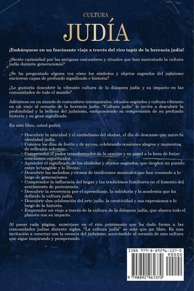 ¡Embárquese en un fascinante viaje a través del rico tapiz de la herencia judía! ¿Siente curiosidad por las antiguas costumbres y rituales que han sustentado la cultura judía durante generaciones? ¿Se ha preguntado alguna vez cómo los símbolos y objetos sagrados del judaísmo encierran capas de profundo significado e historia? ¿Le gustaría descubrir la vibrante cultura de la diáspora judía y su impacto en las comunidades de todo el mundo? Adéntrese en un mundo de costumbres intemporales, rituales sagrados y cultura vibrante en un viaje al corazón de la herencia judía. "Cultura judía" le invita a descubrir la profundidad y la belleza del judaísmo, enriqueciendo su comprensión de su profunda historia y su gran significado. En este libro, usted podrá: Descubrir la santidad y el simbolismo del shabat, el día de descanso que nutre la identidad judía. Conozca los días de festín y de ayuno, celebrando ocasiones alegres y momentos de reflexión solemne. Comprender el poder transformador de la oración y su papel a la hora de forjar conexiones espirituales. Aprender el significado de los símbolos y objetos sagrados, que tienden un puente entre lo tangible y lo Divino. Descubrir las melodías y ritmos de tradiciones musicales que han resonado a lo largo de generaciones. Comprender la influencia del hogar y las tradiciones familiares en el fomento del sentimiento de pertenencia. Descubrir la reverencia por el aprendizaje, la sabiduría y la academia que ha definido la cultura judía. Descubrir una celebración del arte judío, la creatividad y sus expresiones a lo largo de la historia. Emprender un viaje a través de la cultura de la diáspora judía, que abarca todo el planeta con su impacto.