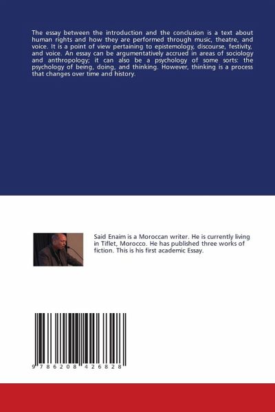 The essay between the introduction and the conclusion is a text about human rights and how they are performed through music, theatre, and voice. It is a point of view pertaining to epistemology, discourse, festivity, and voice. An essay can be argumentatively accrued in areas of sociology and anthropology; it can also be a psychology of some sorts: the psychology of being, doing, and thinking. However, thinking is a process that changes over time and history.