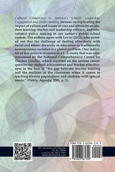 Cultural Competence in America's Schools: Leadership, Engagement and Understanding focuses on explicating the impact of culture and issues of race and ethnicity on student learning, teacher and leadership efficacy, and educational policy making in our nation's public school system. The authors agree with Levin (2012), who pointed out that the challenge of dealing effectively with racial and ethnic diversity in education in traditionally homogeneous societies is a global problem. One indicator of this point is revealed in a U.S. study that was commissioned by the National Comprehensive Center for Teacher Quality, which reported on the serious consequences for student achievement and teacher effectiveness in the face of "the gap between teacher training and the realities of the classroom when it comes to teaching diverse populations and students with special needs." (Public Agenda, 2008, p. 2).