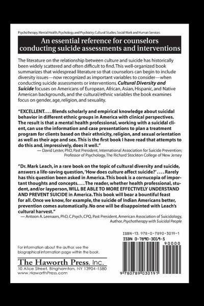 Preface Acknowledgments Chapter 1. Introduction How Does Culture Affect Suicide? A Brief History of Suicide Definitions of Suicide Typical Risk Factors Usually Associated with Suicide Suicide Assessment Suicide Prevention Crisis Intervention and Culture Traditional Counseling and Psychotherapy Approaches Additional Terms Discussed Throughout the Book Chapter 2. European Americans Data Gender Age Religion Gay/Lesbian/Bisexual/Transgender Issues Summary Chapter 3. African Americans Data Gender Age Cultural Buffers Gay/Lesbian/Bisexual/Transgender Issues Suicide Prevention and Intervention Summary Chapter 4. Asian Americans Data and Gender Age Religious and Spiritual Issues Specific Ethnic Groups Gay/Lesbian/Bisexual/Transgender Issues Buddhist Views of Death and Dying Hindu Views of Death and Dying Specific Cultural Groups Suicide Prevention and Intervention Summary Chapter 5. Hispanic Americans Data and Gender Age Cultural Buffers Gay/Lesbian/Bisexual/Transgender Issues Suicide Prevention and Intervention Summary Chapter 6. Native Americans History Data Gender Tribal Affiliation and Acculturation Methods and Concomitant Factors Spirituality and Religion Views of Death, Suicide, and the Afterlife Death Rituals and Mourning Gay/Lesbian/Bisexual (Two-Spirit) Issues Suicide Prevention and Intervention Summary References Index