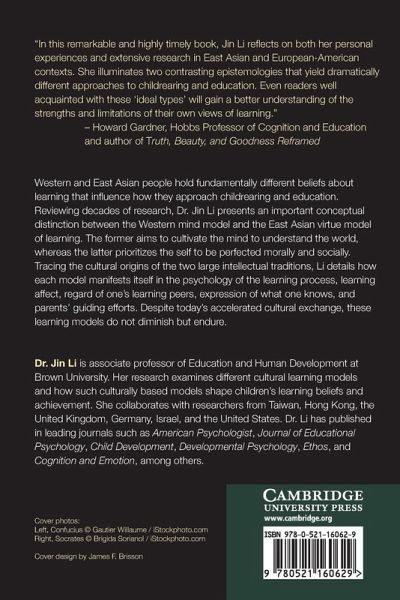 Western and East Asian people hold fundamentally different beliefs about learning that influence how they approach child rearing and education. Reviewing decades of research, Dr Jin Li presents an important conceptual distinction between the Western mind model and the East Asian virtue model of learning. The former aims to cultivate the mind to understand the world, whereas the latter prioritizes the self to be perfected morally and socially. Tracing the cultural origins of the two large intellectual traditions, Li details how each model manifests itself in the psychology of the learning process, learning affect, regard of one's learning peers, expression of what one knows and parents' guiding efforts. Despite today's accelerated cultural exchange, these learning models do not diminish but endure.