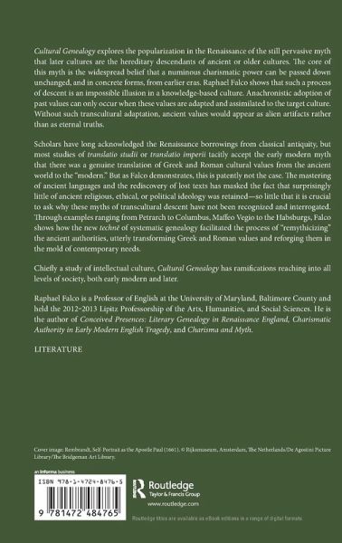 Cultural Genealogy explores the popularization in the Renaissance of the still pervasive myth that later cultures are the hereditary descendants of ancient or older cultures. Through examples ranging from Petrarch to Columbus, Maffeo Vegio to the Hapsburgs, Falco shows how the new techne of systematic genealogy facilitated the process of "remythicizing" the ancient authorities, utterly transforming Greek and Roman values and reforging them into the mold of contemporary needs.