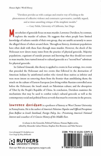 Cultural Genocide establishes a theoretical basis for understanding why groups can be readily brought to seek the elimination of out-groups using the tactic of cultural destruction. Lawrence Davidson applies his theory to four uses of cultural genocide, with two pre-Holocaust case studies and two post-Holocaust case studies. He examines the mechanisms that may be used to combat today’s cultural genocide as well as the contemporary social and political forces at work that must be overcome in the process.