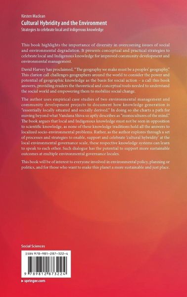 The author uses empirical case studies of two environmental management and community development projects to document how knowledge generation is "essentially locally situated and socially derived." In doing so she charts a path for moving beyond what Vandana Shiva so aptly describes as "monocultures of themind." The book argues that local and Indigenous knowledge must not be seen in opposition to scientific knowledge, as none of these knowledge traditions hold all the answers to localized socio-environmental problems. Rather, as the author explores through a set of processes and strategies to enable, support and celebrate 'cultural hybridity' at the local environmental governance scale, these respective knowledge systems can learn to speak to each other. Such dialogue has the potential to support more sustainable outcomes at multiple environmental governance locales.
