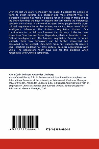 Over the last 30 years, technology has made it possible for people to travel to other cultures in a cheaper and more efficient way. The increased traveling has made it possible for an increase in trade and as the trade flourishes the need for people that can handle the differences between the cultures in the world increase. Some people handle cross-cultural negotiations better than others; we want to know how Cultural Intelligence influences The Business Negotiation Process. Our contributions to the field are foremost the discovery of the two new dimensions: Structure and Power Dependency that can be added to both Cultural intelligence and The Business Negotiation Process. In future research, these two dimensions can be further researched and developed. In our research, statements from our respondents create a small practical guideline for cross-cultural business negotiations with China. The negotiators might have use for this guideline when negotiating with Chinese companies.