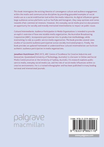 Cultural Intermediaries: Audience Participation in Media Organisations is intended to provide an explicit overview of how one notable media organization, the Australian Broadcasting Corporation (ABC), incorporates participation into its production methodology, while maintaining its role as a public service media organisation. The book provides several cases studies of successful audience participation across socially motivated projects. Finally, the book provides an updated framework to understand how cultural intermediation can facilitate authentic audience participation in media organisations.