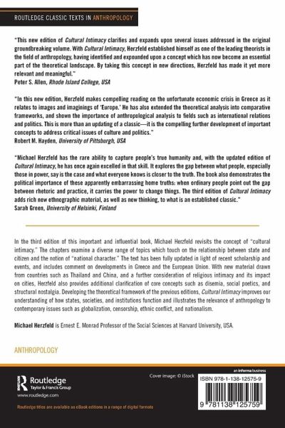 In the third edition of this important and influential book, Michael Herzfeld revisits the idea of 'cultural intimacy'. The chapters examine a range of topics touching on the relationship between state and citizen, and the notion of 'national character'. Herzfeld provides a developed theoretical framework and additional clarification of core concepts such as disemia, social poetics and structural nostalgia. The text has been fully updated in light of recent scholarship and events, including comment on Greece and the European Union. There is new material drawn from regions such as Thailand and China, and further consideration of religious intimacy and its impact on cities. The book improves our understanding of how states, societies and institutions function and illustrates the relevance of anthropology to contemporary issues such as globalization, censorship, ethnic conflict and nationalism.