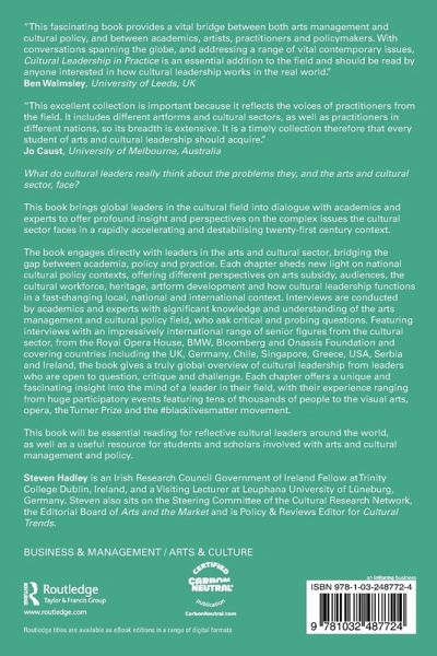 The book engages directly with leaders in the arts and cultural sector, bridging the gap between academia, policy and practice. Each chapter sheds new light on national cultural policy contexts, offering different perspectives on arts subsidy, audiences, the cultural workforce, heritage, artform development and how cultural leadership functions in a fast-changing local, national and international context. Interviews are conducted by academics and experts with significant knowledge and understanding of the arts management and cultural policy field, who ask critical and probing questions. Featuring interviews with an impressively international range of senior figures from the cultural sector, from the Royal Opera House, BMW, Bloomberg and Onassis Foundation and covering countries including the UK, Germany, Chile, Singapore, Greece, USA, Serbia and Ireland, the book gives a truly global overview of cultural leadership from leaders who are open to question, critique and challenge. Each chapter offers a unique and fascinating insight into the mind of a leader in their field, with their experience ranging from huge participatory events featuring tens of thousands of people to the visual arts, opera, the Turner Prize and the #blacklivesmatter movement.