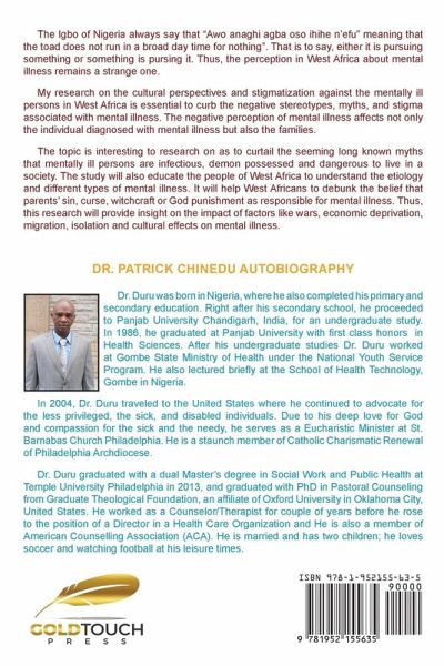 The Igbo of Nigeria always say that "Awo anaghi agba oso ihihe n'efu" meaning that the toad does not run in a broad day time for nothing". That is to say, either it is pursuing something or something is pursing it. Thus, the perception in West Africa about mental illness remains a strange one. My research on the cultural perspectives and stigmatization against the mentally ill persons in West Africa is essential to curb the negative stereotypes, myths, and stigma associated with mental illness. The negative perception of mental illness affects not only the individual diagnosed with mental…mehr