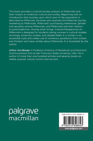 This book provides a cultural studies analysis of Millennials and their impact on American culture and society. Beginning with an introduction that touches upon which part of the population is described as Millennial, the book also explores the Millennial psyche, marketing to Millennials, Millennials' purchasing preferences, gender and sexuality among Millennials, and Millennials and their relation to postmodernism, among other things. Cultural Perspectives on Millennials is designed for students taking courses in cultural studies, sociology, American studies and related fields. It is written in an accessible style and makes use of numerous quotations from writers and thinkers who have written about Millennials. It is illustrated by the author.