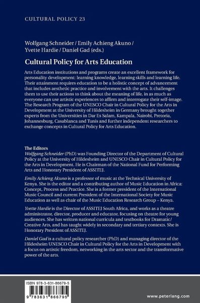 Wolfgang Schneider (PhD) was Founding Director of the Department of Cultural Policy at the University of Hildesheim and UNESCO Chair in Cultural Policy for the Arts in Development. He is Chairman of the National Fund for Performing Arts and Honorary President of ASSITEJ. Emily Achieng Akuno is a professor of music at the Technical University of Kenya. She is the editor and a contributing author of Music Education in Africa: Concept, Process and Practice. She is a former president of the International Music Council and current President of the International Society for Music Education as well as chair of the Music Education Research Group - Kenya. Yvette Hardie is the Director of ASSITEJ South Africa, and works as a theatre administrator, director, producer and educator, focusing on theatre for young audiences. She has written national curricula and textbooks for Dramatic/Creative Arts, and has taught widely in secondary and tertiary contexts. She is Honorary President of ASSITEJ. Daniel Gad is a cultural policy researcher (PhD) and managing director of the Hildesheim UNESCO Chair in Cultural Policy for the Arts in Development with a focus on artistic freedom, networking in the arts sector and the transformative power of the arts.