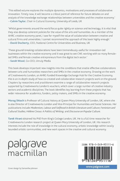 Chapter 1. Introduction; Morag Shiach and Tarek E. Virani.- Chapter 2. Cultural Policy, Collaboration and Knowledge Exchange; Morag Shiach and Tarek E. Virani.- Chapter 3. Bringing the Past into the Present: Mobilising Historical Research through Creative and Digital Collaboration; John Price.- Chapter 4. Creating Archival Value in a Changing Mediascape: The "World in a Cube" Project; Ian Christie with Wendy Earle, Eleni Liarou, Karen Merkel, Akim Mogaji.- Chapter 5. Consumer As Producer; Value Mechanics in Digital Transformation Design Process, Practice and Outcomes; Karen Cham.- Chapter 6. Goldsmiths Digital: Research and Innovation in the Creative Economy; Mick Grierson.- Chapter 7. Getting Inside the Creative Voucher: The Platform 7 Experience; Andy Pratt and John McKiernan.- Chapter 8. Devising Bespoke Art and Design Interventions for a Dialysis Community; Rachel Louis and Luise Vormittag.- Chapter 9. The BeatWoven Project; Noam Shemtov.- Chapter 10. At Home with Collaboration: Building and Sustaining a Successful University-Museum Partnerships; Alastair Owens, Eleanor John and Alison Blunt.- Chapter 11. Connections-Movements-Treasures: Unlocking the Potential of the June Givanni Pan African Cinema Archive; Emma Sandon and June Givanni.- Chapter 12. Process as Outcome: Research across Borders; Caspar Melville.- Chapter 13. Social Art Map: Reflections on a Creative Collaboration; Emily Druiff and Sophie Hope.- Chapter 14. Making Friends: Childhood, the Cultural Economy and Creative Collaboration through Technology; Tessa Whitehouse and Emilie Giles.- Chapter 15. Outside the Voucher: Evaluating the Creative Voucher Scheme; Andy Pratt, Helen Matheson-Pollock, and Tarek E. Virani.- Chapter 16. Creative Collaborations: The Role of Networks, Power and Policy; Roberta Comunian.