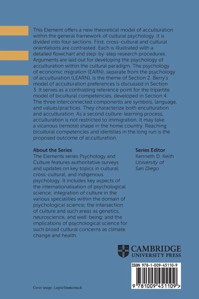 This Element offers a new theoretical model of acculturation within the general framework of cultural psychology. Three interconnected components symbols, language, and values/practices characterize both enculturation and acculturation. Reaching bicultural competencies and identities is the proposed outcome.