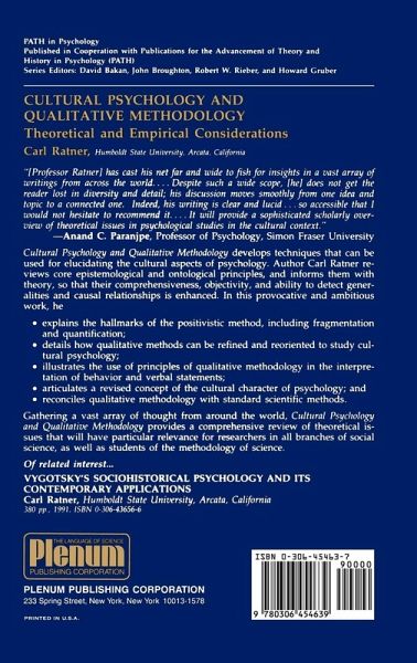 Qualitative methodologies in cultural psychology often lack the objective and verifiable character of quantitative analysis. Author Carl Ratner corrects this shortcoming by rigorously systematizing qualitative methods. The book discusses, for example, means of systematizing such subjective reports as interviews, letters, and diaries, which often yield valuable data that is not easily quantified. Ratner argues that "complex psychological phenomena are expressed through extended responses" and hence are best studied by new, more regularized qualitative methods that go beyond measuring simple, overt responses.…mehr