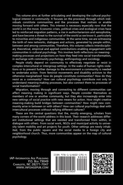 This volume aims at further articulating and developing the cultural psychological interest in community. It focuses on the processes through which individuals constitute communities and the processes that restrain or enable moving forward with others. This interest is necessary especially now that the world is on the move. Economic crises, political crises and ecological crises have led to reinforced migration patterns, a rise in authoritarianism and xenophobia, and have become a threat to the survival of the world as we know it, particularly to minorities and indigenous communities. At the same time, we are witnessing the birth of new networks, dialogues and actions, generated by people within, between and among communities. Therefore, this volume collects interdisciplinary theoretical, empirical and applied contributions enabling engagement with communities in cultural psychology. This involves both reflections on meaning-making processes and projections on how they feed into social transformation, in exchange with community psychology, anthropology and sociology. People vitally depend on community to effectively negotiate or resist in complex intercultural or intergroup settings. In the wake of human rights violations or to prevent further damage to the environment a community is needed to undertake action. From feminist movements and disability activism to the otherwise marginalized: how do people constitute communities? How do they resist as a community? How can cultural psychology contribute not only to understand meaning-making processes, but also connect them to processes of social transformation? Migration, moving through and connecting to different communities can affect meaning making in significant ways. People consider themselves as members of one or another community, but they also increasingly enter into new settings of social practice with new means for action. How might creative meaning-making build bridges between communities? How might new community arise in between or with others? How can cultural psychology deal with intercultural processes without reifying different cultures? These are the central questions that the, mostly emerging, scholars from many corners of the world address in this book. Their research addresses different institutional settings that are resisted and transformed from within, in dialogue with others. From social work, NGOs and municipal activity to university talent mobility and art projects for youth. Other settings are newly inhabited, from the public square and the social media to a foreign city and neighborhood church. Thus, more communities appear on the map of cultural psychology.