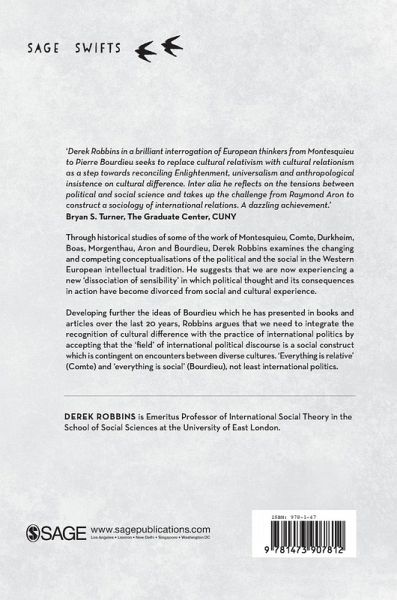 - Bryan S. Turner, The Graduate Center, CUNY Through historical studies of some of the work of Montesquieu, Comte, Durkheim, Boas, Morgenthau, Aron and Bourdieu, Derek Robbins examines the changing and competing conceptualisations of the political and the social in the Western European intellectual tradition. He suggests that we are now experiencing a new 'dissociation of sensibility' in which political thought and its consequences in action have become divorced from social and cultural experience. Developing further the ideas of Bourdieu which he has presented in books and articles over the last twenty years, Robbins argues that we need to integrate the recognition of cultural difference with the practice of international politics by accepting that the 'field' of international political discourse is a social construct which is contingent on encounters between diverse cultures. 'Everything is relative' (Comte) and 'everything is social' (Bourdieu), not least international politics.