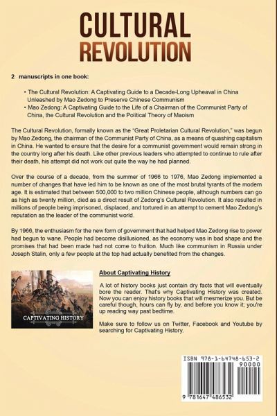 If you want to discover the captivating history of the Cultural Revolution, then keep reading... Two captivating manuscripts in one book: The Cultural Revolution: A Captivating Guide to a Decade-Long Upheaval in China Unleashed by Mao Zedong to Preserve Chinese Communism Mao Zedong: A Captivating Guide to the Life of a Chairman of the Communist Party of China, the Cultural Revolution and the Political Theory of Maoism The Cultural Revolution, known in full as the "Great Proletarian Cultural Revolution," was launched by Mao Zedong, the chairman of the Communist Party of China, as a means of quashing capitalism in China. He wanted to ensure that the desire for a communist government would remain strong in the country long after his death. Like other previous leaders who attempted to continue to rule after their death, his attempt did not work out quite the way he had planned. Over the course of a decade, from the summer of 1966 to 1976, Mao Zedong implemented a number of changes that have led him to be known as one of the most brutal tyrants of the modern age. It is estimated that between 500,000 to two million Chinese people, although numbers can go as high as twenty million, died as a direct result of Zedong’s Cultural Revolution. It also resulted in millions of people being imprisoned, displaced, and tortured in an attempt to cement Mao Zedong’s reputation as the leader of the communist world. Some of the topics covered in part 1 of this book include: Mao Zedong’s Early Life, Rise to Power, and the Government Upheaval That Changed China during the First Half of the 20th Century The Suspicion Behind the United Face The Five-Year Plan, the Great Leap Forward, and the Events Leading to the Cultural Revolution fighting the Capitalism of the West The Introduction of Revolution The Red Guards July 20th Incident Border Clashes with the Communist Soviets Lin Biao – The Successor and Opponent Health Issues and Slipping Grip on the Revolution The 10th Congress and the Shifting of Power Mass Killings in China and Devastation in Northern China End of the Cultural Revolution Lasting Effects And much, much more! Some of the topics covered in part 2 of this book include: Early Life Political Awakenings Beijing May Fourth and the New Culture Movement The Communist Party of China’s Growing Pains The Northern Expedition Communists at Large The Long March The People’s Republic of China The Great Leap Forward The Cultural Revolution What Did Maoism Stand For? And much more! So if you want to learn more about the Cultural Revolution and Mao Zedong, scroll up and click the "add to cart" button!