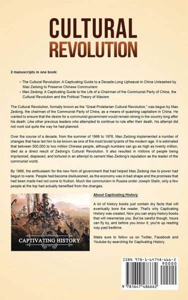 If you want to discover the captivating history of the Cultural Revolution, then keep reading... Two captivating manuscripts in one book: The Cultural Revolution: A Captivating Guide to a Decade-Long Upheaval in China Unleashed by Mao Zedong to Preserve Chinese Communism Mao Zedong: A Captivating Guide to the Life of a Chairman of the Communist Party of China, the Cultural Revolution and the Political Theory of Maoism The Cultural Revolution, known in full as the "Great Proletarian Cultural Revolution," was launched by Mao Zedong, the chairman of the Communist Party of China, as a means of quashing capitalism in China. He wanted to ensure that the desire for a communist government would remain strong in the country long after his death. Like other previous leaders who attempted to continue to rule after their death, his attempt did not work out quite the way he had planned. Over the course of a decade, from the summer of 1966 to 1976, Mao Zedong implemented a number of changes that have led him to be known as one of the most brutal tyrants of the modern age. It is estimated that between 500,000 to two million Chinese people, although numbers can go as high as twenty million, died as a direct result of Zedong's Cultural Revolution. It also resulted in millions of people being imprisoned, displaced, and tortured in an attempt to cement Mao Zedong's reputation as the leader of the communist world. Some of the topics covered in part 1 of this book include: Mao Zedong's Early Life, Rise to Power, and the Government Upheaval That Changed China during the First Half of the 20th Century The Suspicion Behind the United Face The Five-Year Plan, the Great Leap Forward, and the Events Leading to the Cultural Revolution fighting the Capitalism of the West The Introduction of Revolution The Red Guards July 20th Incident Border Clashes with the Communist Soviets Lin Biao - The Successor and Opponent Health Issues and Slipping Grip on the Revolution The 10th Congress and the Shifting of Power Mass Killings in China and Devastation in Northern China End of the Cultural Revolution Lasting Effects And much, much more! Some of the topics covered in part 2 of this book include: Early Life Political Awakenings Beijing May Fourth and the New Culture Movement The Communist Party of China's Growing Pains The Northern Expedition Communists at Large The Long March The People's Republic of China The Great Leap Forward The Cultural Revolution What Did Maoism Stand For? And much more! So if you want to learn more about the Cultural Revolution and Mao Zedong, scroll up and click the "add to cart" button!