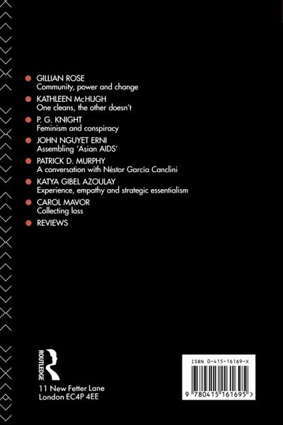 Articles Spatialities of 'community' power and change: The imagined geographies of community projects - Gillian Rose One cleans the other doesn't - Kathleen McHugh Naming the problem: feminism and the figuration of conspiracy - P. G. Knight Of desire the Farang and textual excursions: assembling Asian AIDS - John Nguyet Erni Contrasting perspectives: cultural studies in Latin America and the United States: a conversation with D'estor Garcia Canclini - Patrick D. Murphy Experience empathy and strategic essentialism - Katya Gibel Azoulay Collecting loss - Carol Mavor.