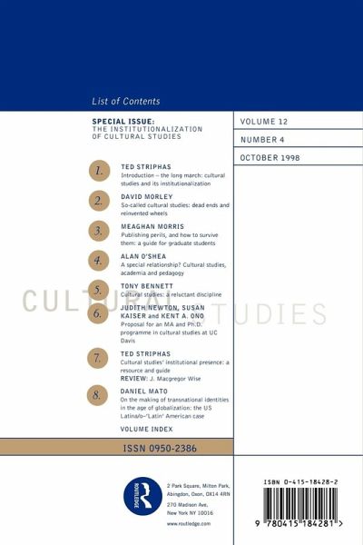 This special issue looks at the increasing presence of Cultural Studies as a discipline within academia. The debate about it's relevance still rages and is commented on in these pages. Also includes tips on publishing for academics and a guide to Cultural Studies institutional presence. A must for all students and graduates in the field.
