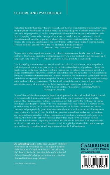1. General introduction to cultural transmission: developmental psychological, social and methodological aspects Ute Schönpflug; 2. Cultural transmission: a short history of research and theory Ute Schönpflug; Part I. Evolutionary Perspective: 3. Cultural transmission: a view from chimpanzees and human infants Michael Tomasello; 4. Transmission, self-organization and the emergence of language: a dynamic systems point of view Paul van Geert; 5. Relationship-specific intergenerational family ties: an evolutionary approach to the structure of cultural transmission Harald A. Euler, Sabine Hoier and Percy A. Rohde; Part II. Cross-Cultural Perspective: 6. An ecocultural perspective on cultural transmission: the family across cultures John W. Berry and James Georgas; 7. Intergenerational relations and cultural transmission Gisela Trommsdorff; 8. Intergenerational transmission, social capital and interethnic contact in immigrant families Bernhard Nauck; 9. Developmental processes related to intergenerational transmission of culture: growing up with two cultures in the U.S.A. Amado M. Padilla; 10. The transmission process: mechanisms and contexts Ute Schönpflug and Ludwig Bilz; 11. Accounting for parent-child value congruence: theoretical considerations and empirical evidence Ariel Knafo and Shalom H. Schwartz; 12. Culture, migration, and family value socialization: a theoretical model and empirical investigation with Russian immigrant youth in Israel Ariel Knafo, Avi Assor, Shalom H. Schwartz and Limor David; 13. Immigrant parents' age expectations for the development of their adolescent offspring: transmission effects and changes after immigration Eva Schmitt-Rodermund and Rainer K. Silberseisen; Part III. Intracultural Variations: 14. Intergenerational transmission of moral capital across the family life course Merril Silverstein and Stephen J. Conroy; 15. Similarity of life goals in the family: a three-generations study Alexander Grob and Wibke Weisheit; 16. The intergenerational transmission of xenophobia and rightism in East Germany Bernd Six, Kristina Geppert and Ute Schönpflug; 17. Intergenerational transmission of violence Haci-Halil Uslucan and Urs Fuhrer; 18. 'Don't trust anyone over 25': youth centrism, intergenerational transmission of political orientations and cultural change Tom ter Bogt, Wim Meeus, Quinten Raaijmakers, Frits van Wel and Wilma Vollebergh; 19. Value transmission and Zeitgeist revisited Klaus Boehnke, Andreas Hadjar and Dirk Baier; 20. Epilogue: towards a model of cultural transmission Ute Schönpflug.