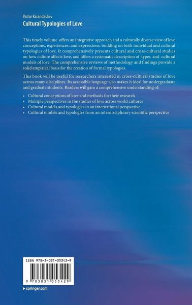 This book will be useful for researchers interested in cross-cultural studies of love across many disciplines. Its accessible language also makes it ideal for undergraduate and graduate students. Readers will gain a comprehensive understanding of: Cultural conceptions of love and methods for their research Multiple perspectives in the studies of love across world cultures Cultural models and typologies in an international perspectiveCultural models and typologies from an interdisciplinary scientific perspective